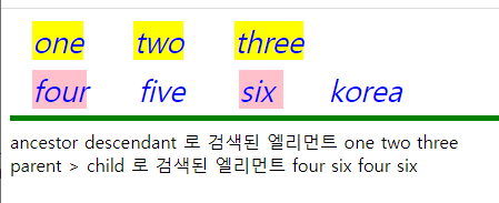 각각 $('p em') 에 해당하는 one , two , three 모두 노란색으로 표현되어 자손인것을 확인 할수있고