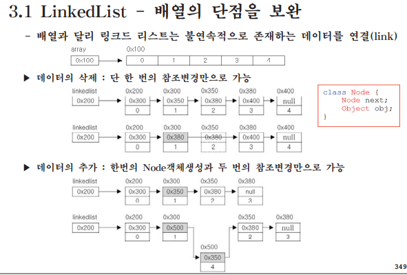 - 단점2 : 비순차적(중간에 넣는것)인 데이터의 추가, 삭제에 시간이 많이 걸린다.