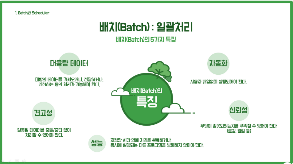 1. Batch와 Scheduler의 차이 1) 배치(Batch)란? 배치(Batch) : 일괄처리 사용자와 상호작용 없이 여러 개의 작업을 미리 정해진 순서에 따라 중단 없이 처리하는 것 2) 스케쥴러(Scheduler)란? 특정한 시간에
