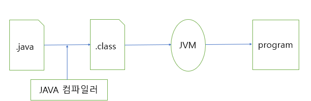 java 소스코드를 컴파일러를 통해 class 파일(java byte code)로 변환하고 byte code 파일을 사용중인 OS에 맞게 구현되어잇는 JVM을 통해 실행하고 프로그램을 동작시킨다.