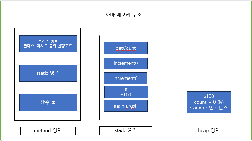 스택영역에서 new로 생성된 Counter의 실제 인스턴스의 영역이고 인스턴스 변수로는 count를 가지고있는다.
