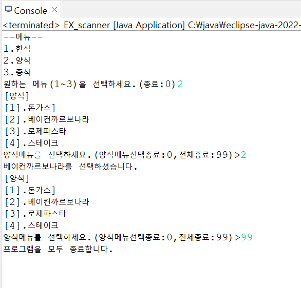 System.out.print("양식메뉴를 선택하세요.(양식메뉴선택종료:0,전체종료:99)>");