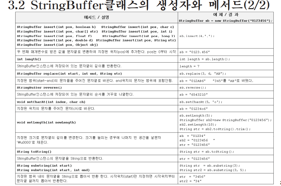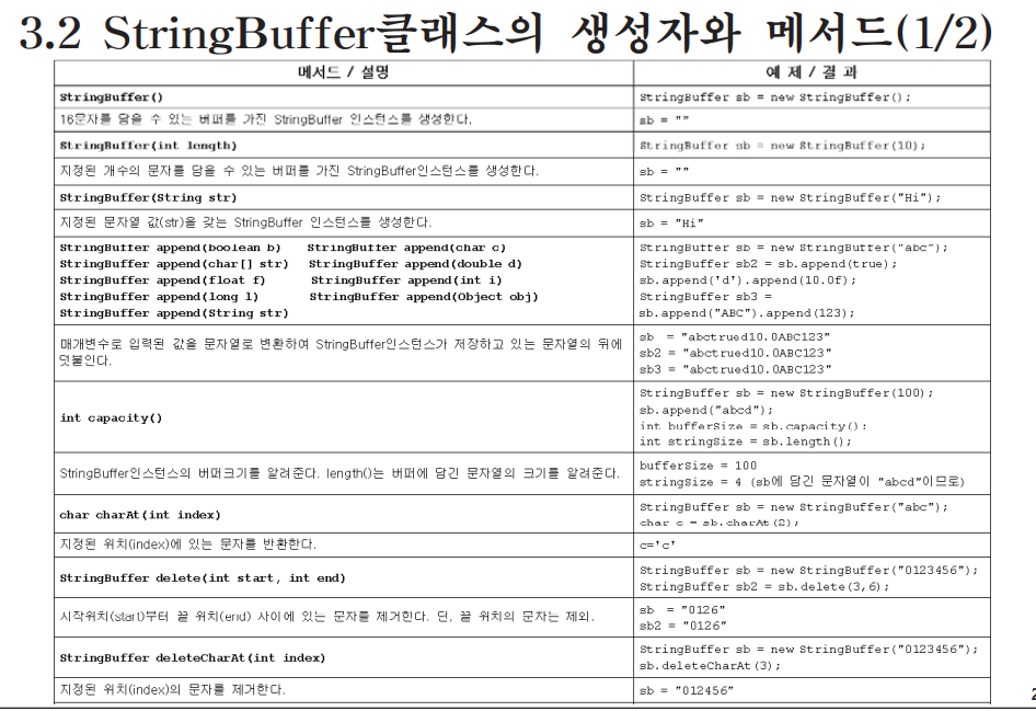 -StringBuffer를 생성할 때는 저장할 문자열의 길이를 고려해서 적절한 크기로 생성해주는 것이 좋다.