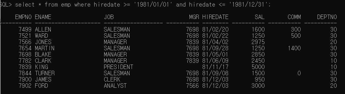 A ] select * from emp where hiredate >= '1981/01/01' and hiredate <= '1981/12/31';