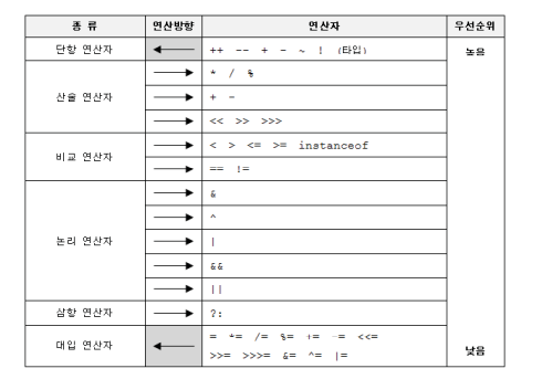- 단항 연산자와 대입연산자를 제외한 모든 연산의 진행 방향은 왼쪽에서 오른쪽 ( -> ) 이다.
